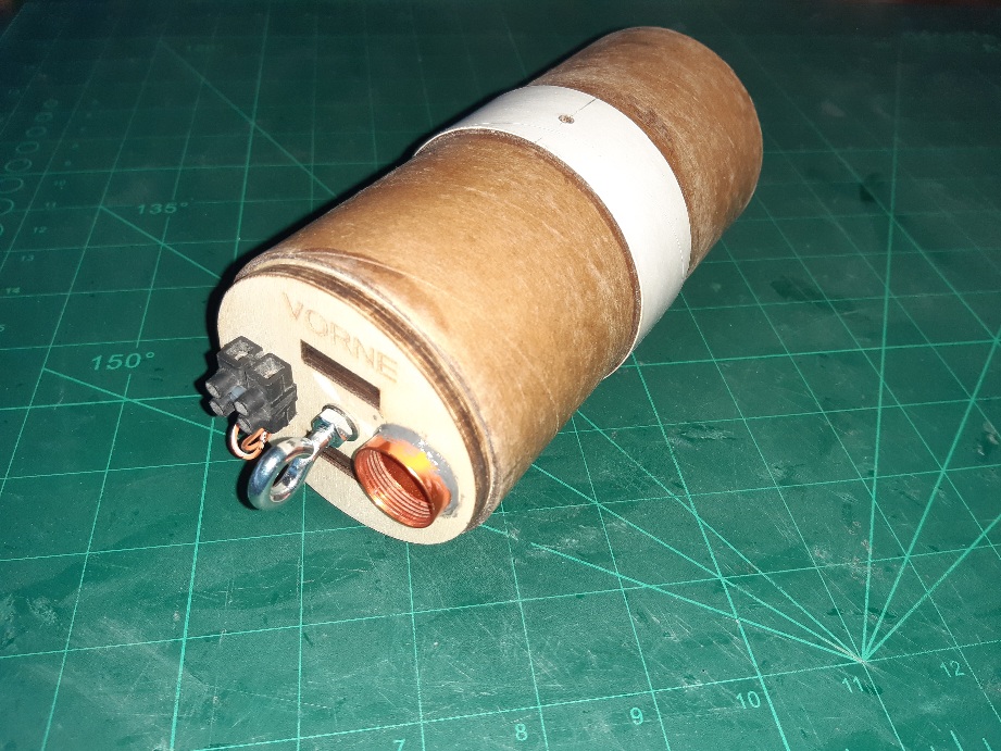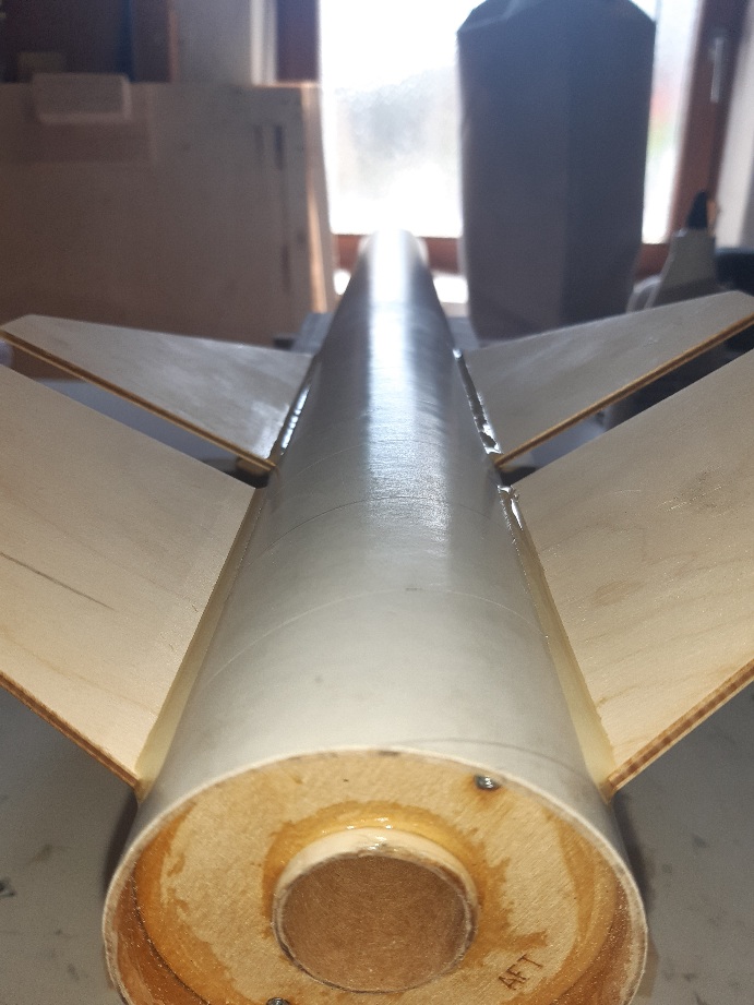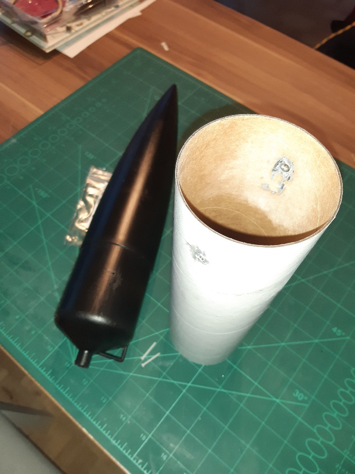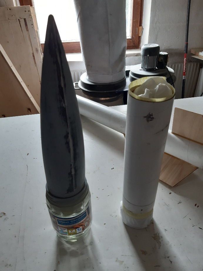Leider geht es aktuell schleppend voran, einfach zu viel zu erledigen. Ich habe mich nun dazu entschieden, beim unteren Körperrohr ein 3mm Venthole zum Druckausgleich zu bohren. Das obere Körperrohr wird mit wiederverwendbaren Kunststoffspreiznieten an der EBay befestigt. Die Spitze wird durch 2mm Kunststoffschrauben als Shearpins gehalten. Damit das Körperrohr durch die Shearpins nicht beschädigt wird habe ich Metallhülsen mit Flansch eingeklebt und passend geschliffen.