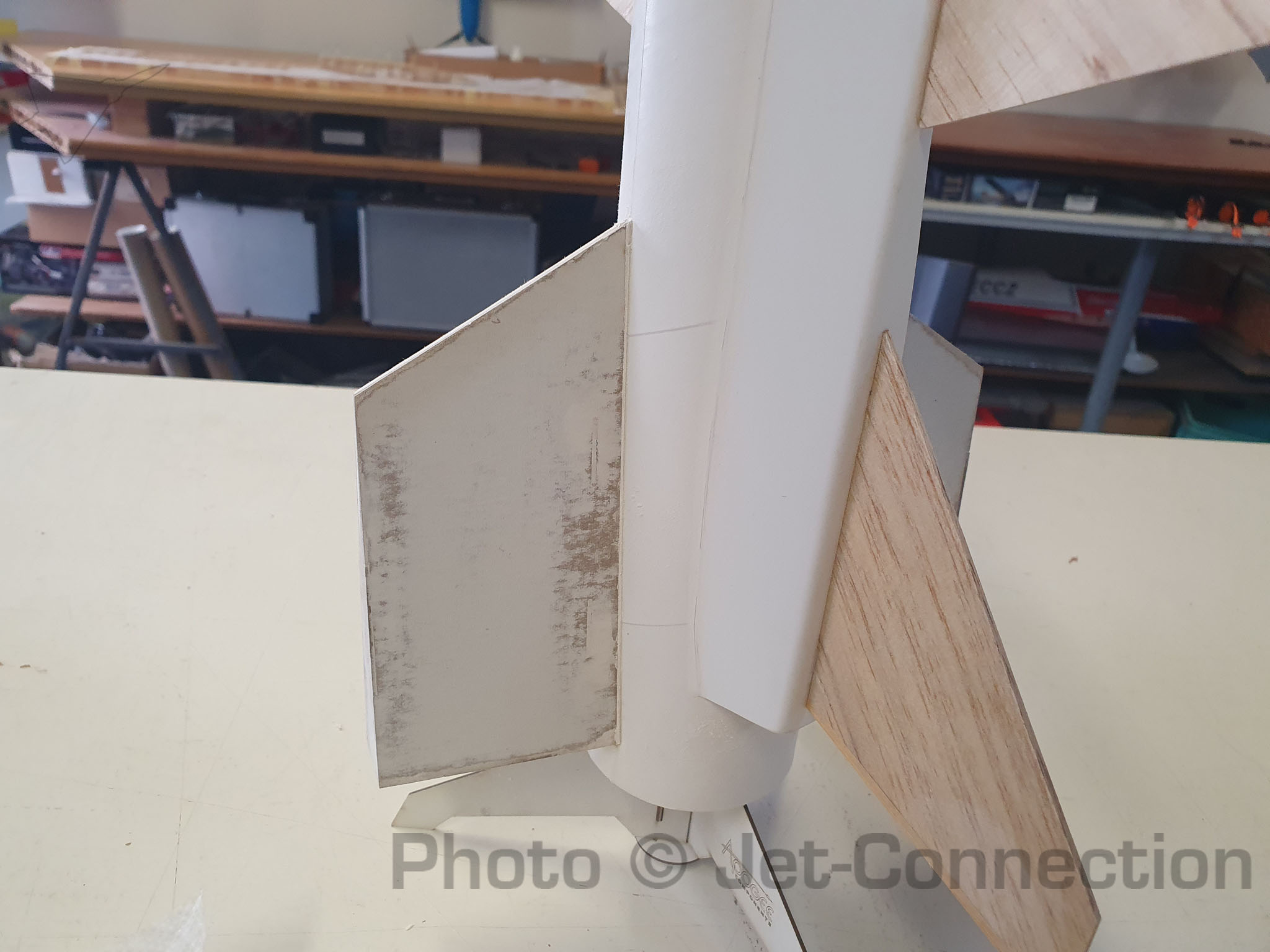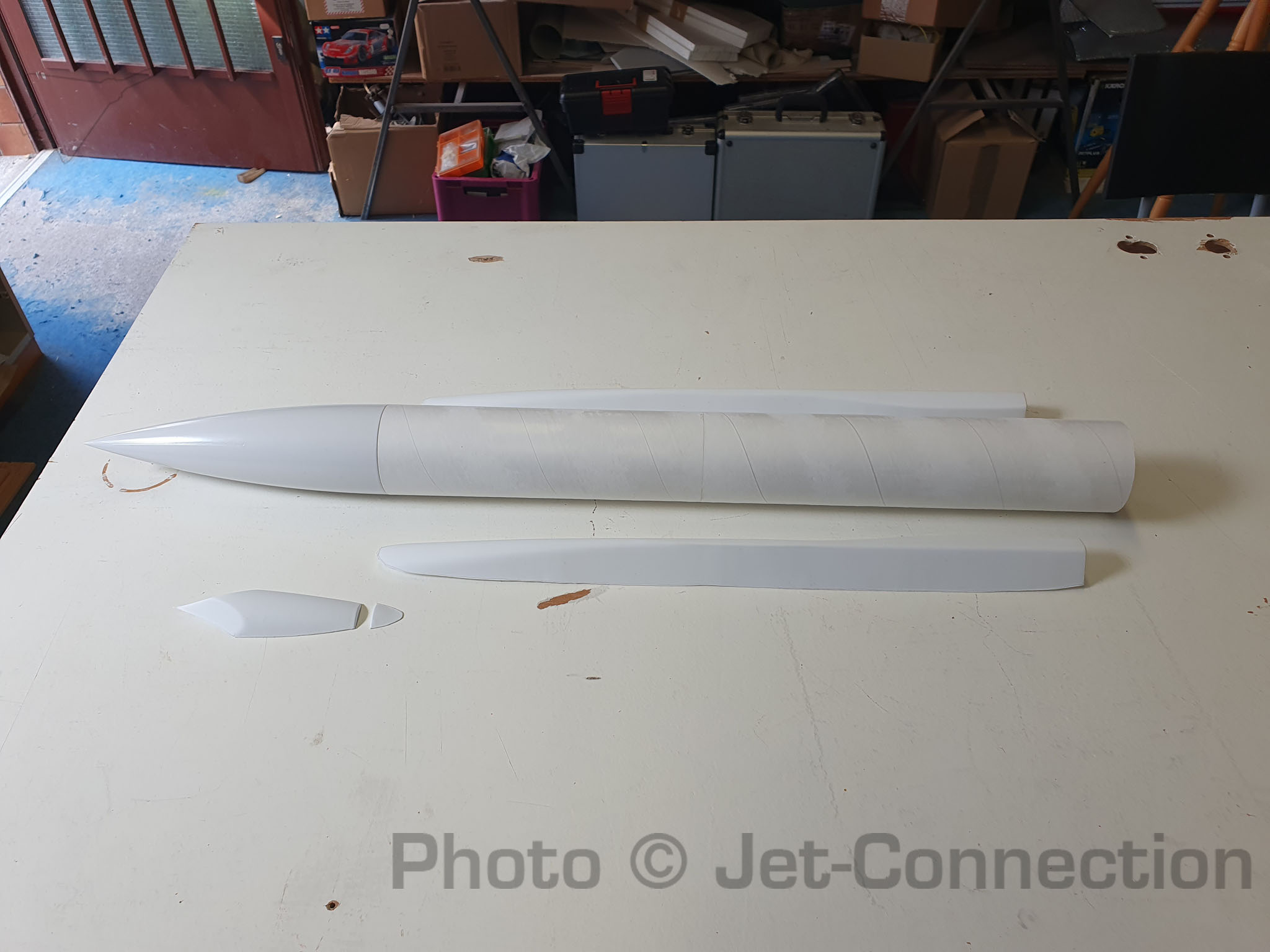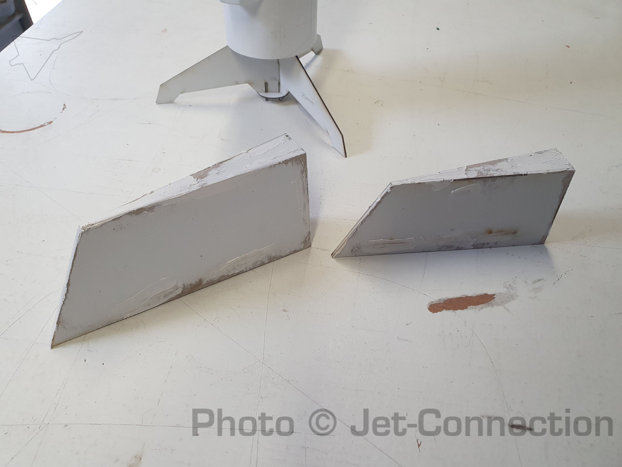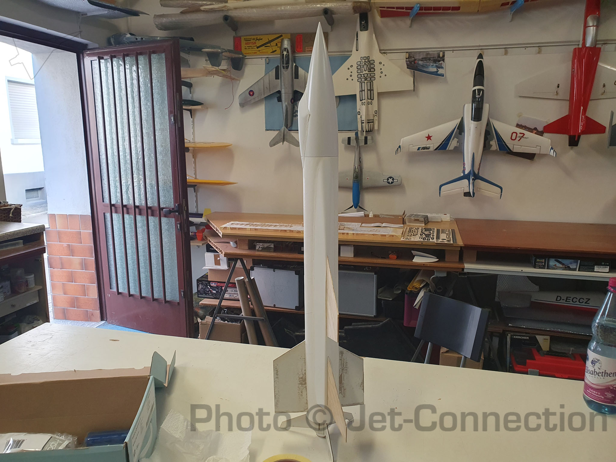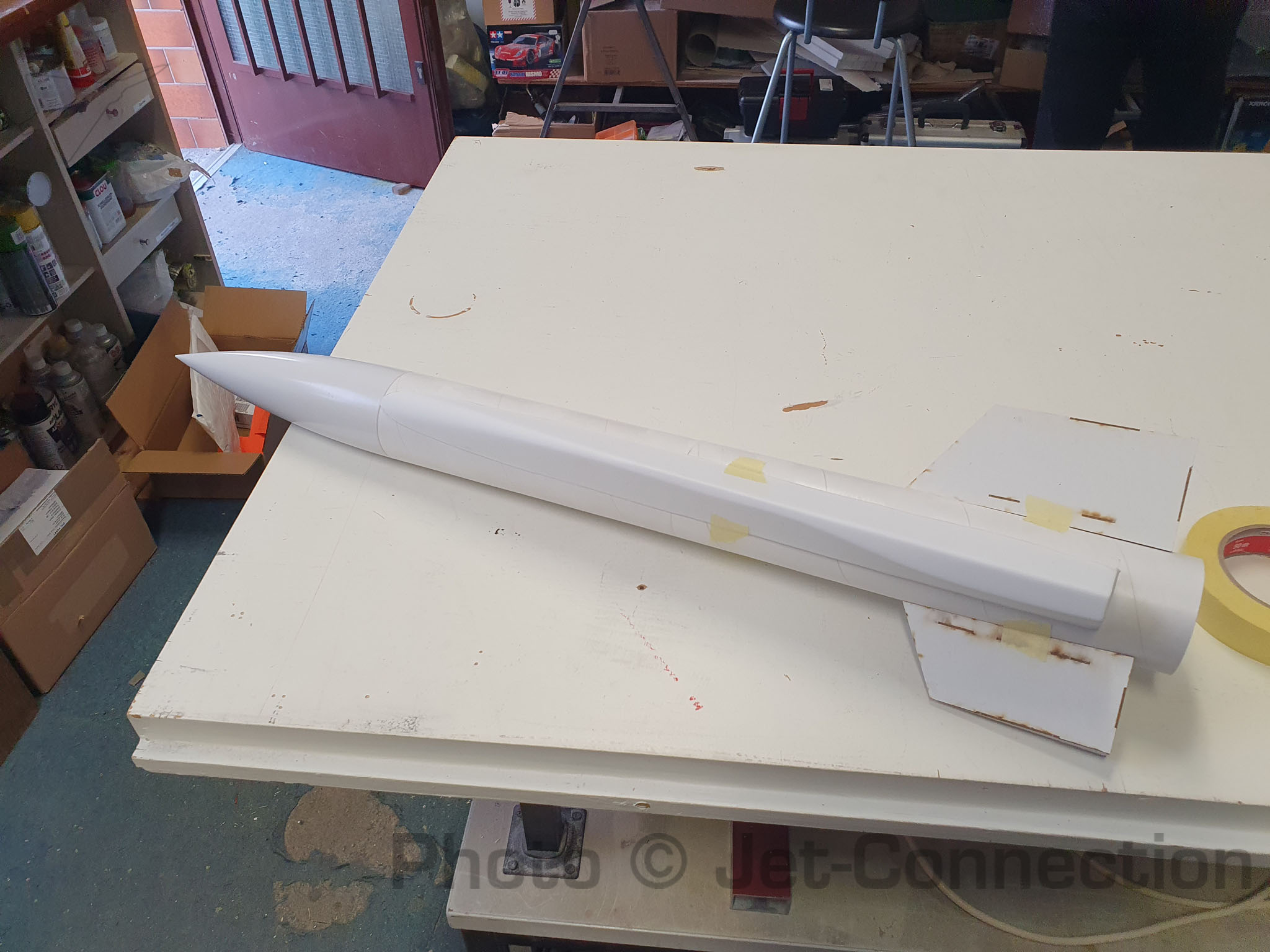 Und weiter gehts. Die Seitenflossen sind montiert und auch das Cockpit ist an seinem Platz samt dem ersten Durchgang Spachtel.  Ich werde wohl ein wenig Porenfüller brauchen um einige Bereiche des Körperrohres und der Finnen zu behandeln da teilweise leicht durchgeschliffen wurde. Sollte aber kein Problem sein. Die Stabilität ist ja weiter gegeben. Als Vorbereitung für das fillern und lackieren sollte das allemal ausreichen. Stand der Dinge jetzt: