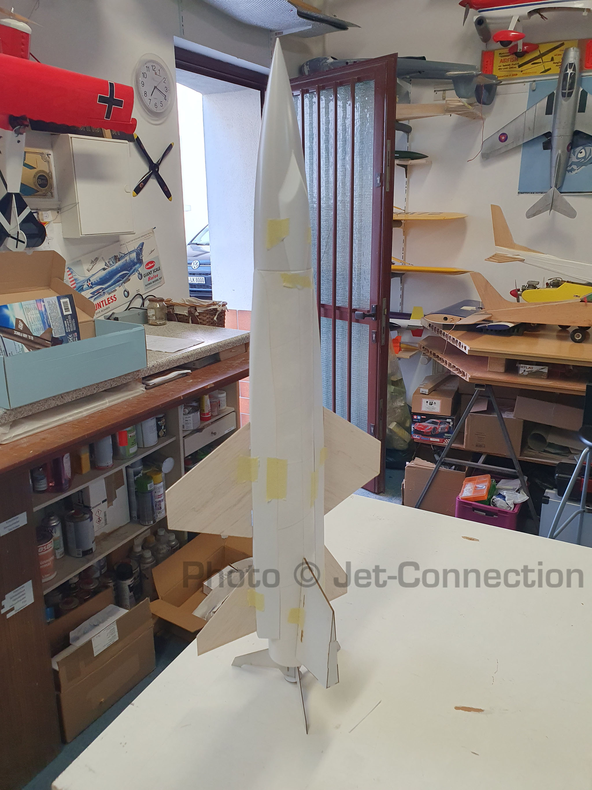 Die Kunststoffteile sind jetzt ausgeschnitten und grob angepasst. Leitwerke wurden fertig gebaut und das Motorrohr samt retainer hat seinen Platz gefunden und wurde mit Epoxy eingeklebt. Ich konnte mir nicht verkneifen das Ganze mal zusammenzustecken und mit ein wenig Tape zu sichern. Sieht doch schon mal aus wie eine X-15