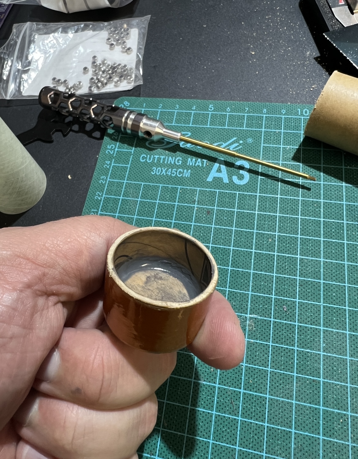 Desweiteren hab ich mir aus nem alten Motorrohr noch nen Kolben gebastelt … der Platz im oberen Kompartment ist begrenzt. Die Chance das der Schirm etc etwas straff im Rohr sitzt vor allem mit Nomex Tuch ist hoch .. deshalb hab ich mich mal wieder für einen Kolben entschieden .. Nomex wird nicht gebraucht und es fliegt sicher alles raus …