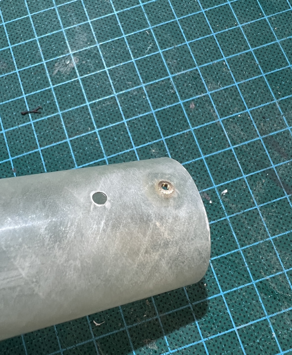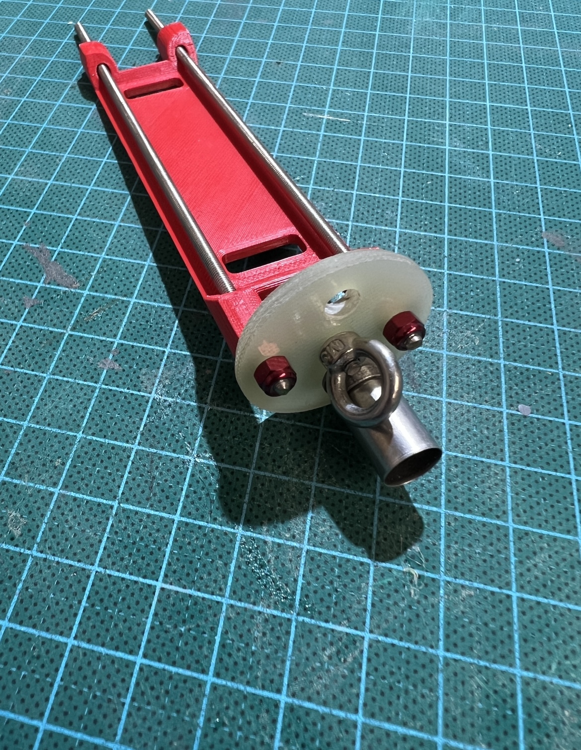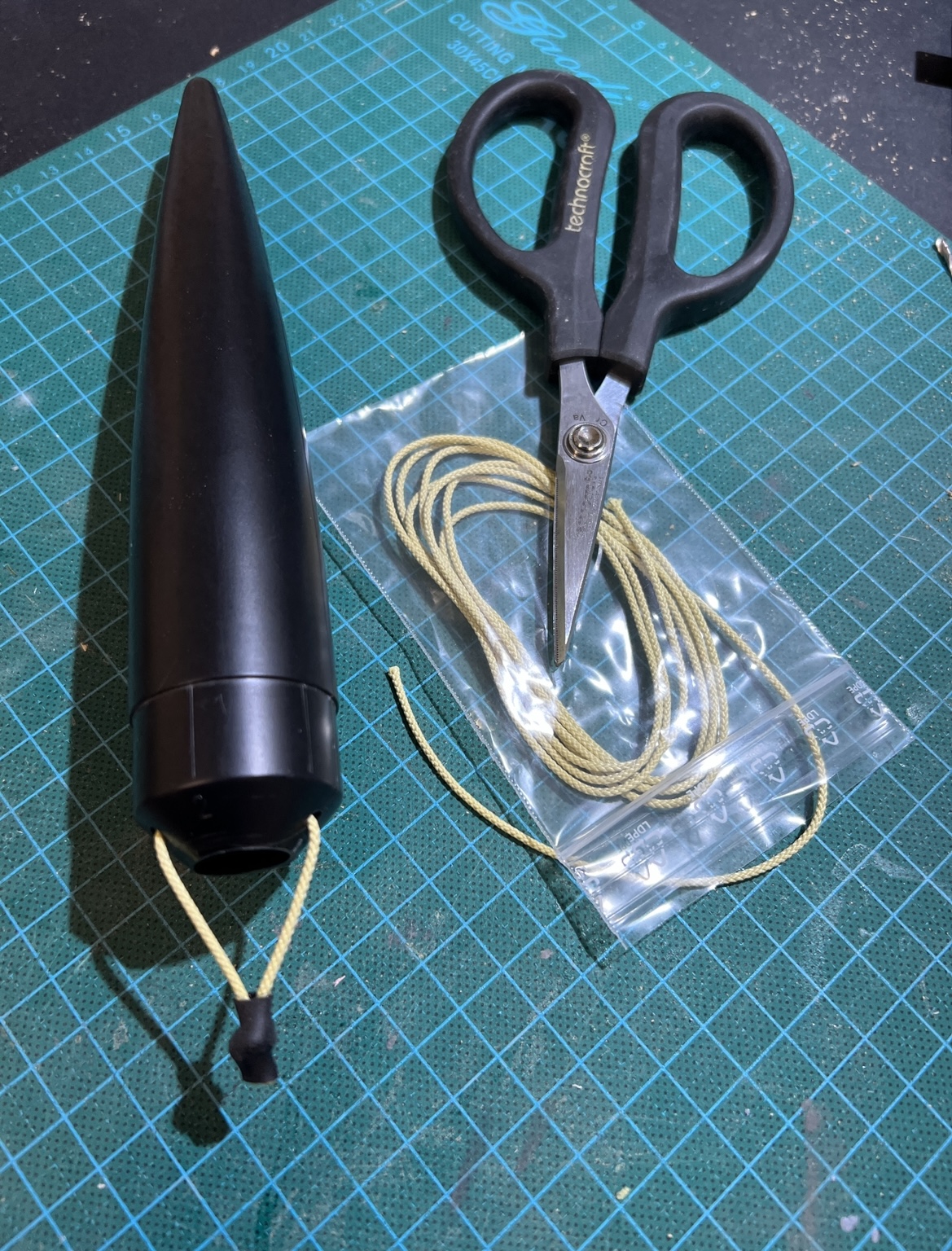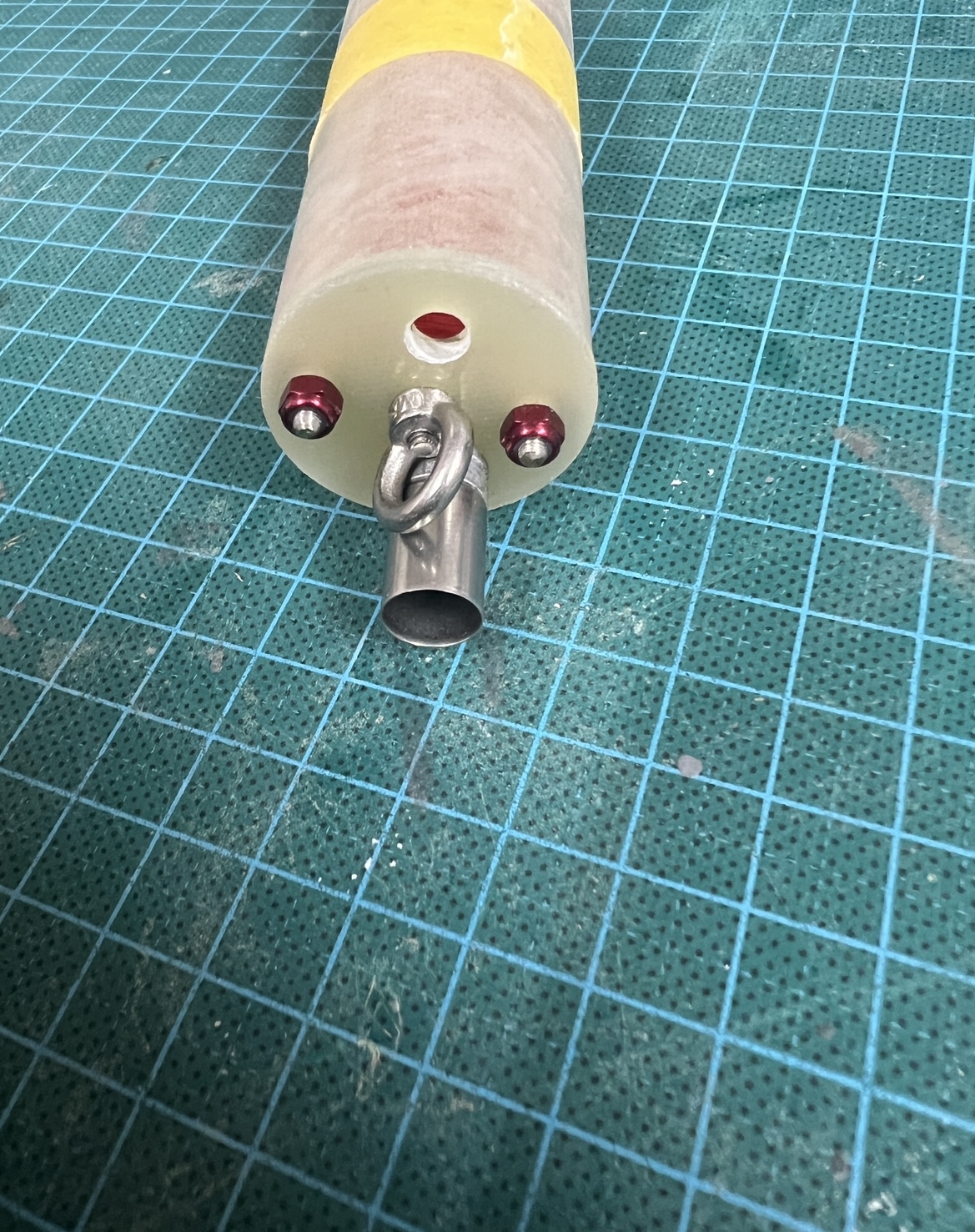 Die Spritzguss Öse hab ich weg genommen und zwei Löcher in den Konus der Spitze gebohrt .. diese nehmen eine Kevlar Schleife als Attachment Punkt auf ..