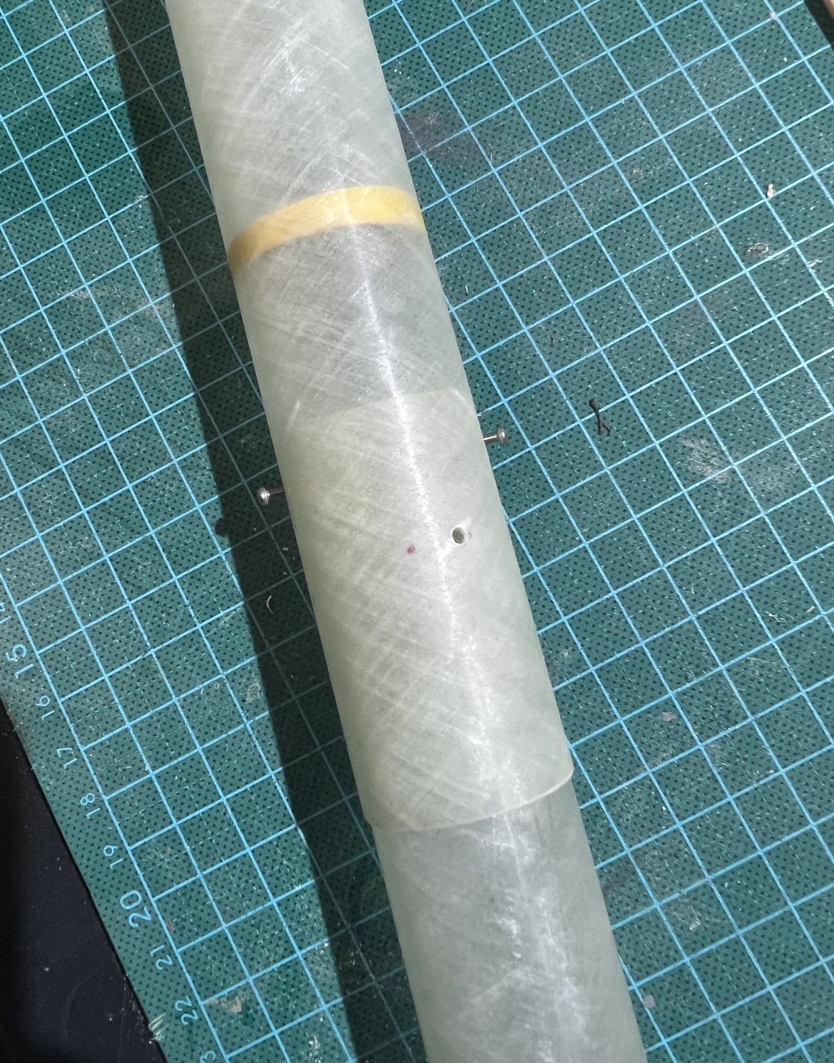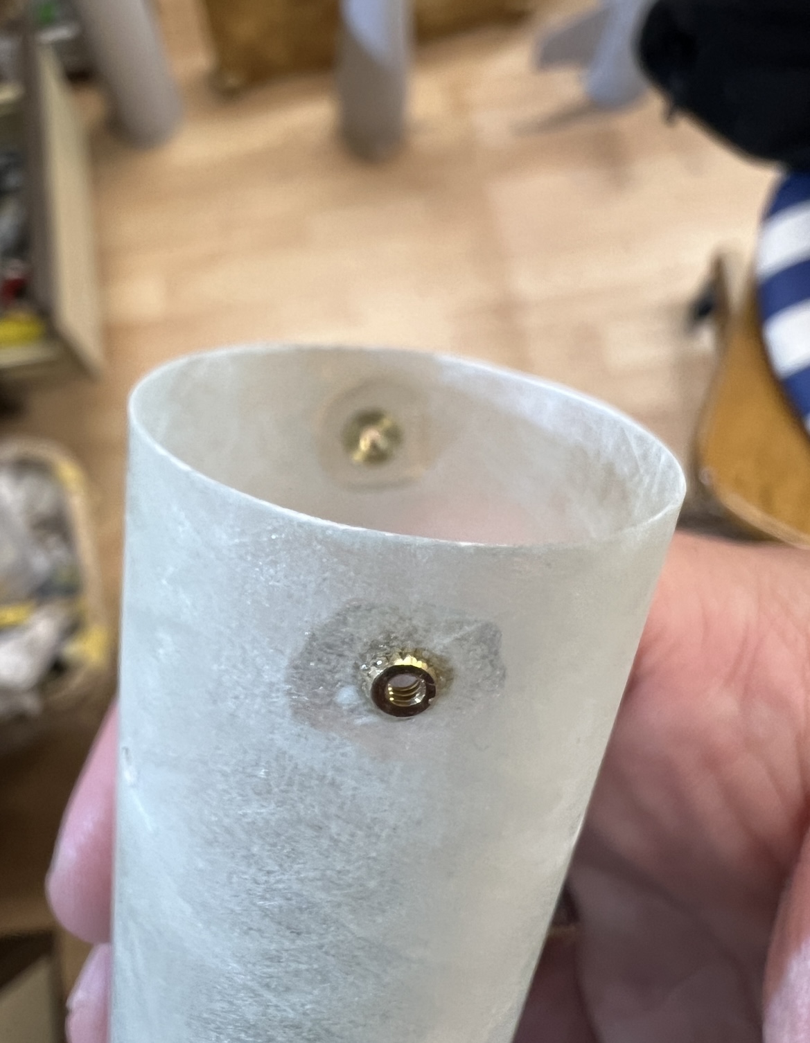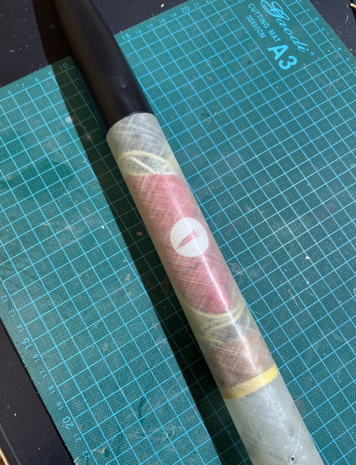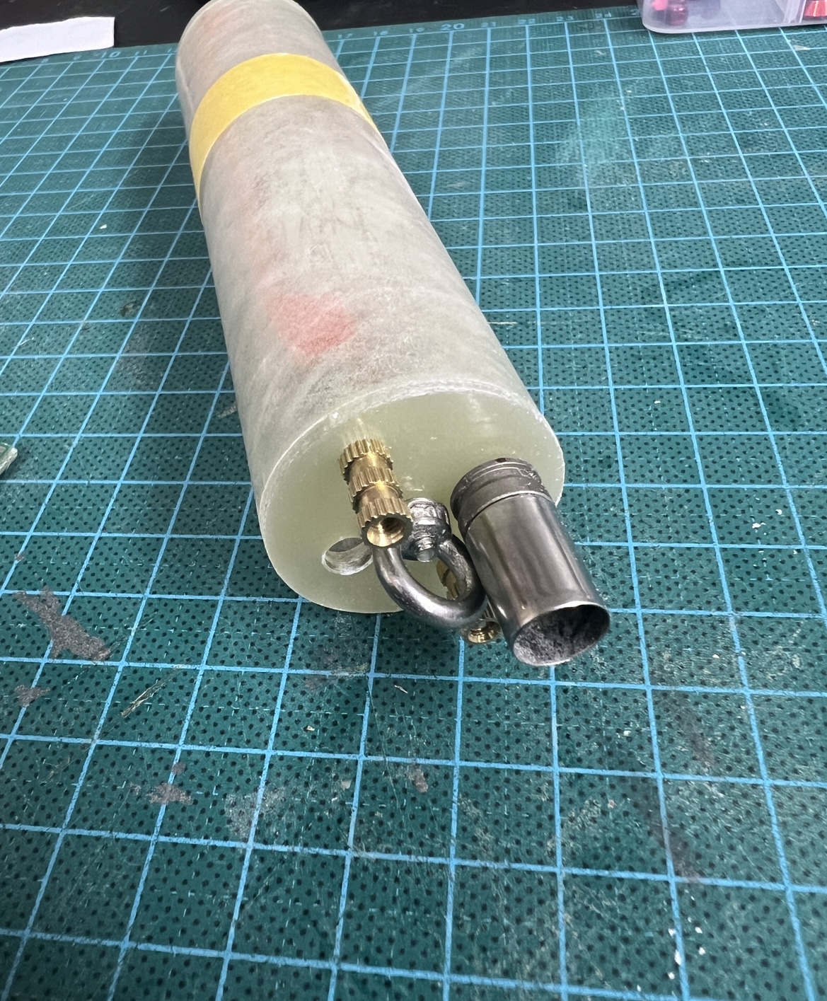 Die Spritzguss Öse hab ich weg genommen und zwei Löcher in den Konus der Spitze gebohrt .. diese nehmen eine Kevlar Schleife als Attachment Punkt auf ..