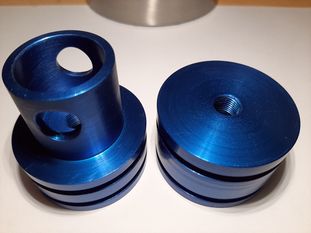 Ich bin mitlerweilen davon abgekommen die flugfähige Hybridhardware neu zu erfinden und selbst zu bauen. Ok, die Verschlüsse bzw. Injektoren lassen sich ja noch gut selbst drehen und eloxieren ( siehe Foto ) aber an der Beschaffung von geeigneten 38 und 54mm Alurohren wo Innen und Außendurchmesser sowie Legierung für unsere Zwecke geeignet sind, daran bin ich auch nach langem intensiven suchen in Deutschland gescheitert....  ! Ähnlich dem 3/16" Füllschlauchproblem, welches jetzt aber Dank Ralfs unablässigen Einsatzes gelöst werden konnte ! Ich denke es macht mehr Sinn sich auf die Herstellung gut funktionierender und leicht herzustellender Reloads zu konzentrieren und da hat Hagen schon sehr gute Ergebnisse geliefert  !!! Andreas