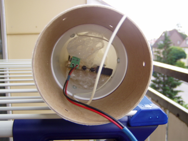Die GPS-Tracker Elektronik wurde in die Spitze meiner Rakete eingebaut, mittels Bubble-Wrap Technik(diese Knallfolie mit den Luftblasen), geht schnell und ist sicher !!!