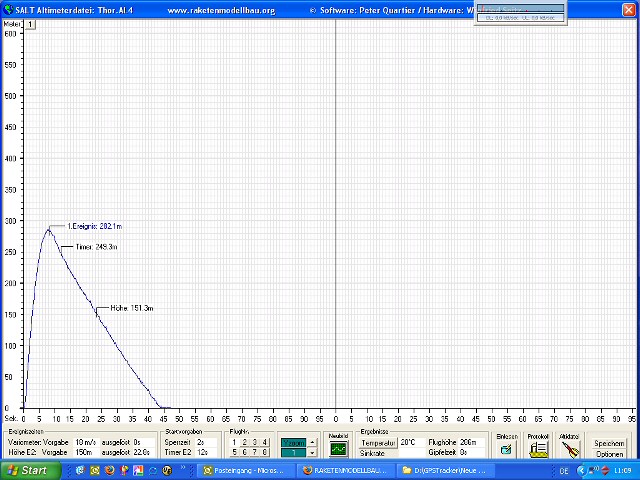 Also Rakete fertig gemacht, dann ab auf die Startrampe. Am Funkgerät ein kräftiges Signal vom GPS-Tracker, das von Laptop dann auch angezeigt wurde. Ich dann beschäftigt mit Startvorbereitungen der Rakete(SALT einschalten, Zünder einbauen usw.) und dann der Start auf Aerotech H180W: