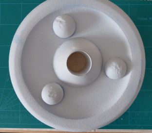 Nach Aufkleben der Styropor-Halbschalen und Grundieren sieht es jetzt so aus: