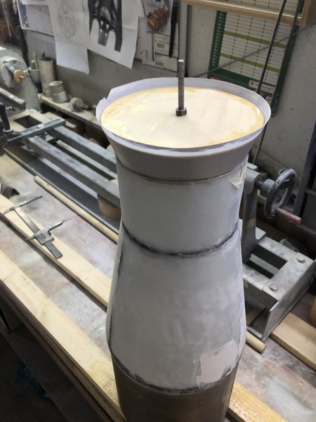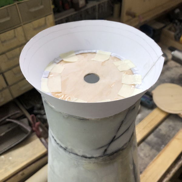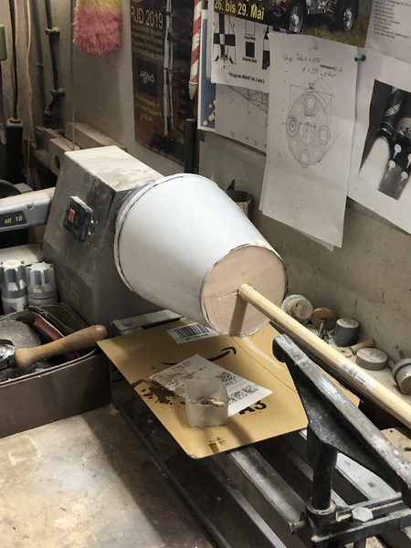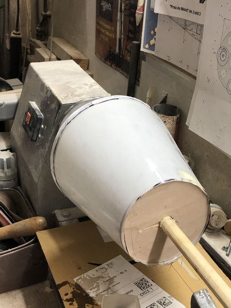 mit deren Hilfe ich aus stabilen Zeichenkarton und einem Stab mit Spannten auf der Drechselbank einen Trägerkonus gefertigt,