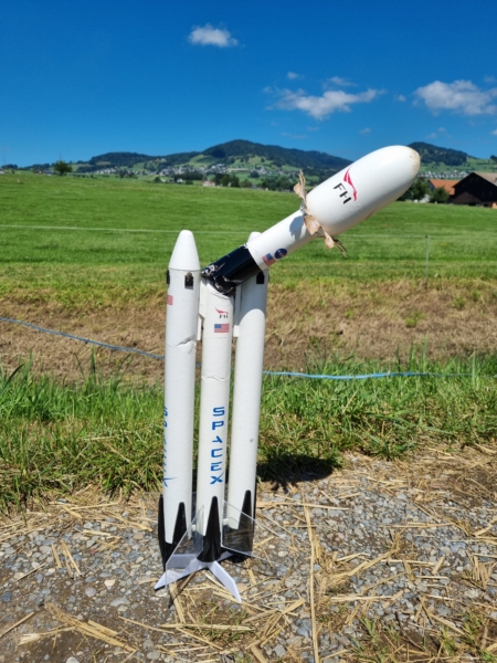 oben am Booster war die Absprengladung. Hat bei Tests gut funktioniert beim echten Flug hat sich nur ein Booster gelöst, hatte da wahrscheinlich zu wenig SP genommen....