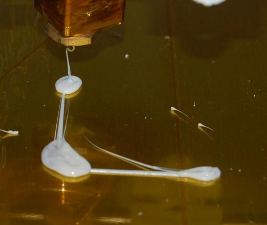 So, Kabel sind halbwegs ordentlich verlegt, Drucker ist so weit eingestellt usw. Aber: Beim Um-die-Ecke-Drucken, bzw. beim Drucken von Radien, wird deutlich zu viel Material extrudiert. Das ganze sieht dann so aus: