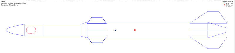 Dort habe ich das Gewicht der Spitze so eingestellt, dass sich der Schwerpunt an der ermittelten Position befindet. Das Gewicht der Leitwerke habe ich nicht berücksichtigt. Da die aber aus PP-Platten werden, kommt nicht wirklich mehr Gewicht drauf.