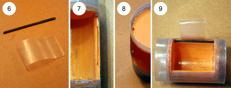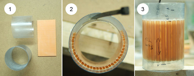 (1) Die Einzelteile: Der Zylnder (außen), PP-Platte 3mm, der zweite Zylinder (PET) für innen.