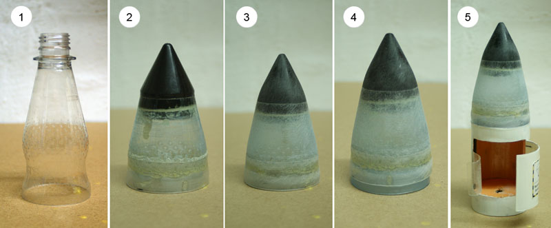 (2) Etwas gekürzt, Spitze einer Silvesterrakete aufgeklebt, An der Verengung einen Übergang mit einem entsprechend geschrumpften Flaschenstück hergestellt.