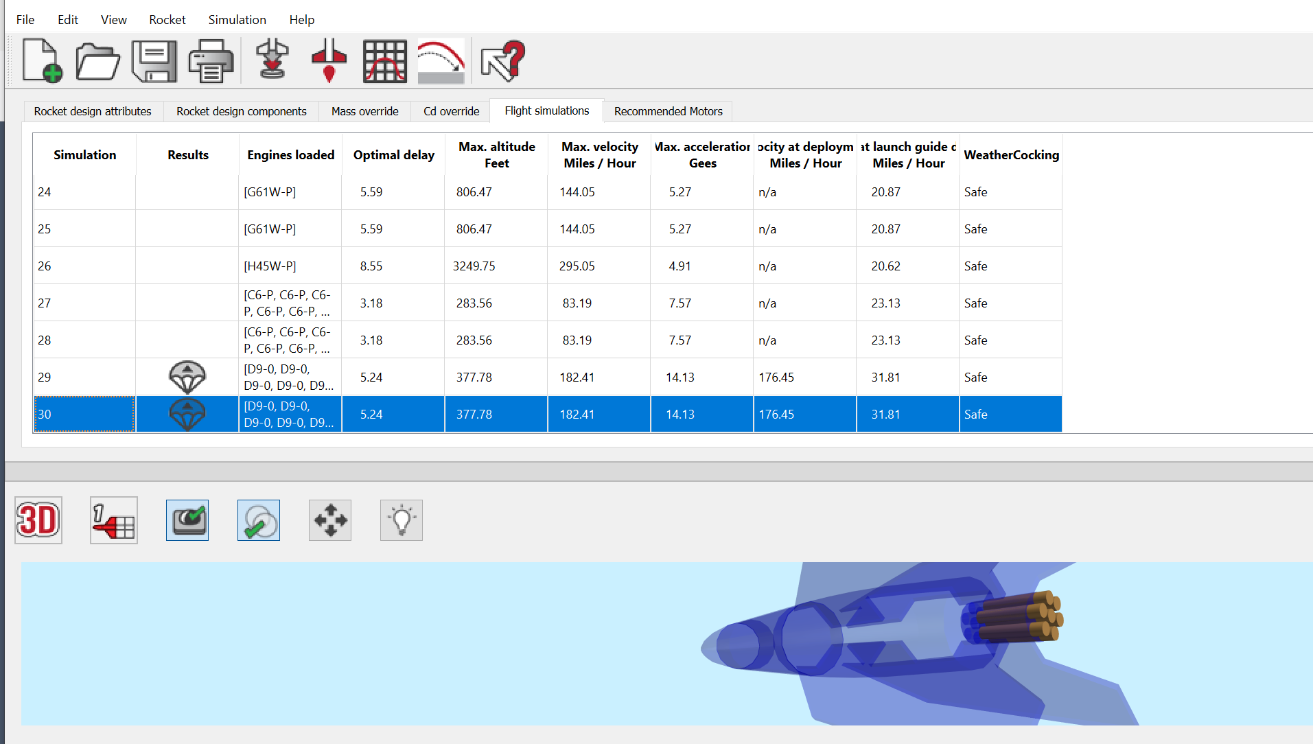 Mit OpenRocket wäre das kein Problem, wenn man die Motordaten von Roberts Webseite heruntergeladen und installiert hat. Vielleicht hat er aber auch etwas für RockSim