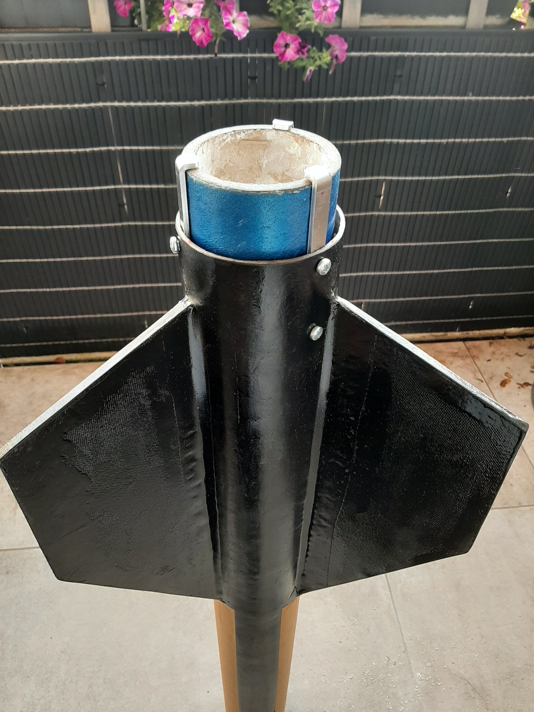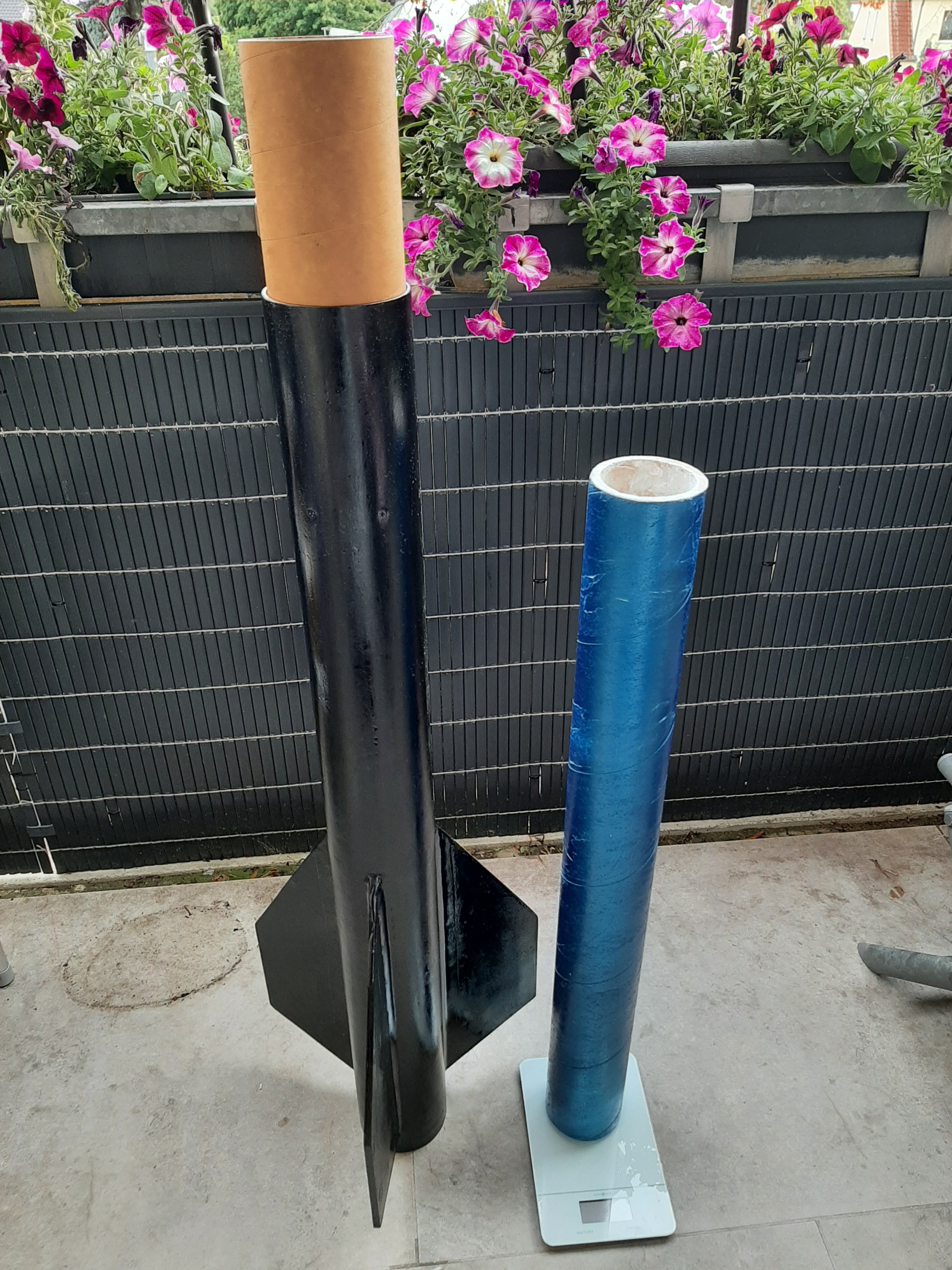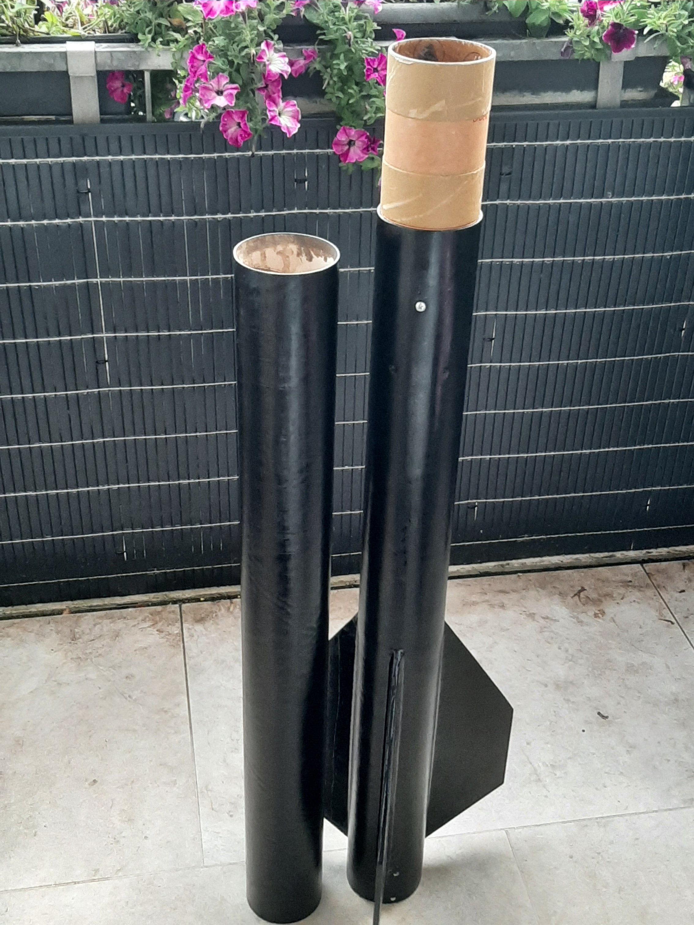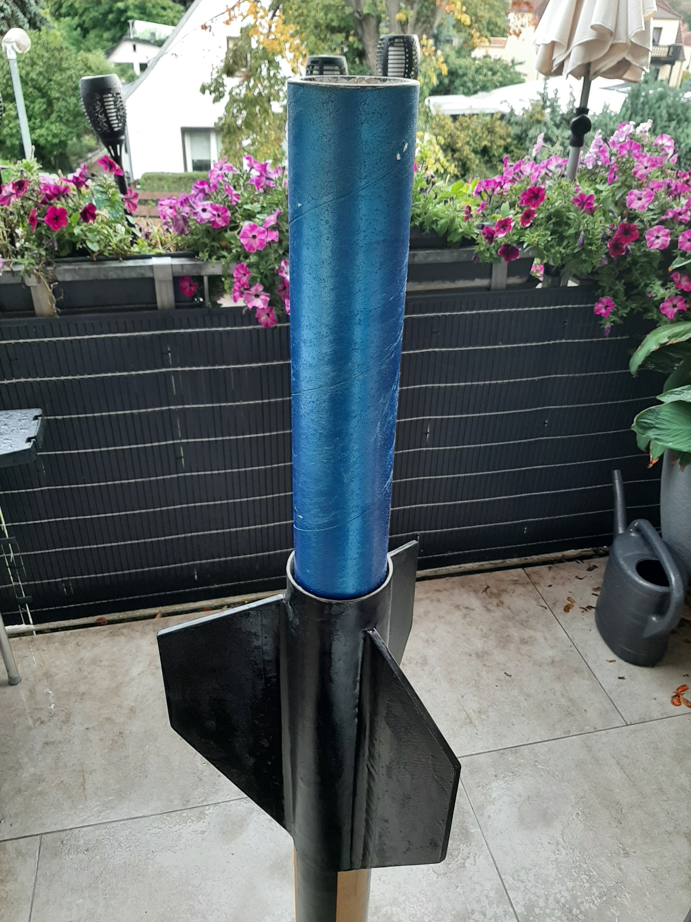 Die Oberflächen der Flossen hab ich mit einer Dose Spritzspachtel noch etwas verbessern können...  Bei der Farbgebung hab ich mich dazu entschieden die IKARUS so wie meine Dragonfire, also schwarzes Heck und gelbes Oberteil + Spitze zu lackieren. So ist sie auch in großen Höhen noch gut zu sehen... Naja, außerdem hatte ich noch ein paar Dosen sehr gut deckendes schwarz von der Medusa übrig.... Hier ist auch gut zu sehen, wie lang der verstärkte Kuppler zum Mittelrohr ist. Andreas