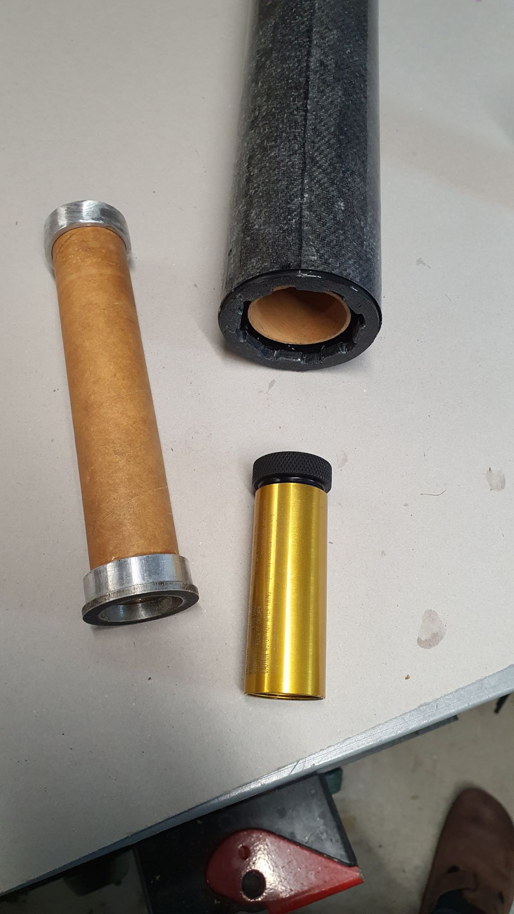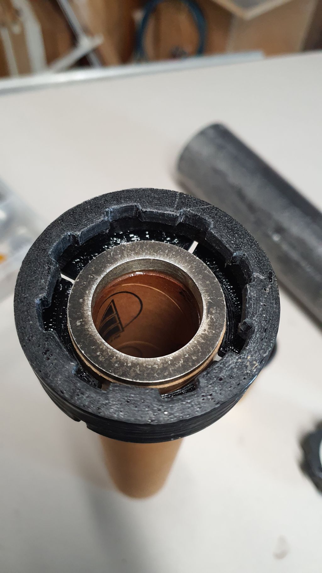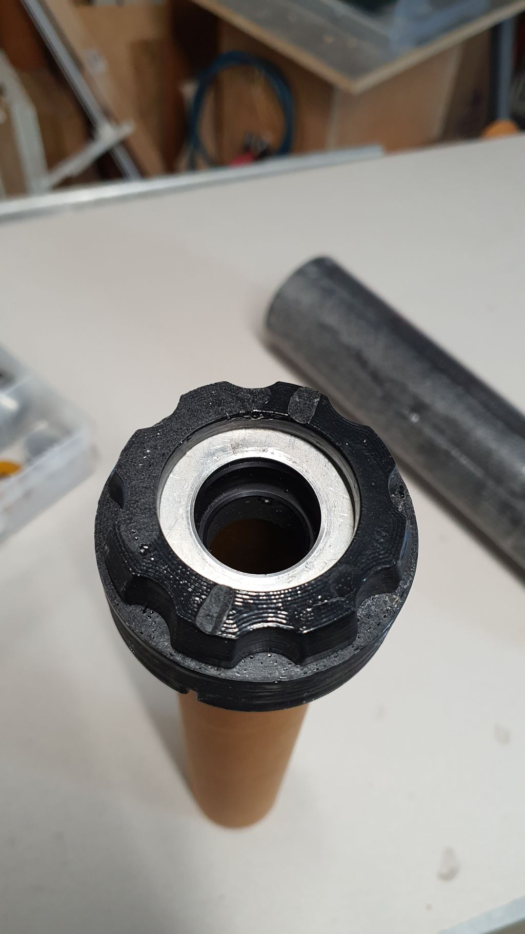 Hier mit 29mm Adapter. Da das 29mm Adapter etwas aufträgt, muss man beim 38mm Motor einen kurzen Ausgleichsring aufschieben. Für den 29mm Verschlussgibt es auch noch eine schöne gedruckte Rückhaltescheibe, die aber leider gerade nicht zu finden ist.