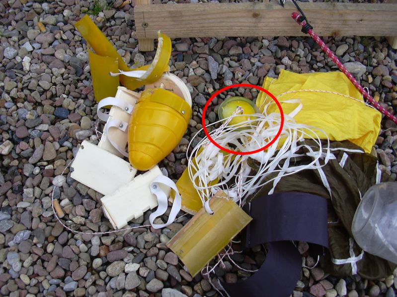 Hallo, als ich den Beitrag las habe ich mich sofort an das Ende meiner "Goldenen" erinnert, lange ist es her. Das die Böden aus der Flasche fliegen habe ich schön öfter erlebt das ist wohl die Stelle die, in einem Flaschenleben, am meisten strapaziert wird. Hier mal ein Bild von vor langer langer Zeit in Lotte. Hier hat es beim aufpumpen den Boden der Flasche herausgerissen und der ist dann zum teil durch das Fallschirmmodul geflogen. Die reste der Rakete hier auf einen Haufen, den Boden hab ich markiert. Gruß Andreas