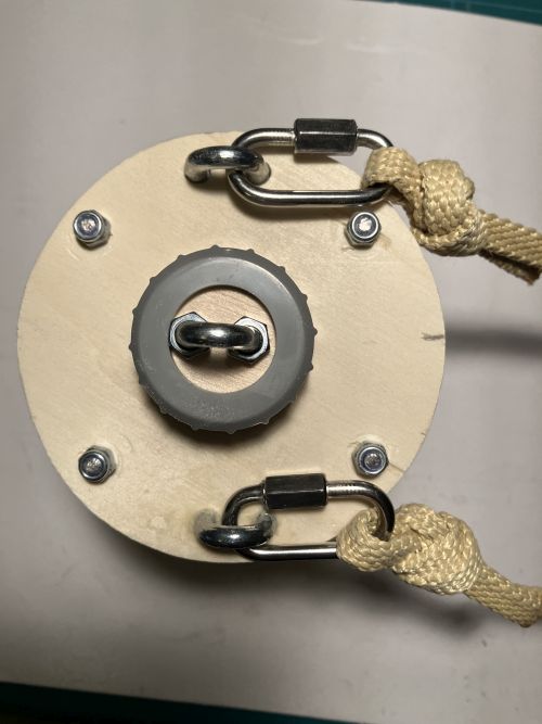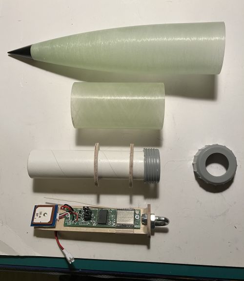 Hier möchte ich zeigen, wie ich den Tracking-Sender eingebaut habe. Mir schwebte eine Lösung vor, die - für die Spitzen kleiner und großer Raketen geeignet ist - es erlaubt, das komplette Modul (Sender Akku, GPS-Empfänger) schnell ein- und auszubauen zum Ein-/Ausschalten, Akku-Laden usw. - und durch Standardisierung den Einsatz eines Moduls in mehreren Raketen ermöglicht Hier die Teile für meine Starlight 38 von Mach1, eine Rakete komplett aus Glasfaser (41 mm Durchmesser): Ich habe mich vom Motoreinbau inspirieren lassen. Ein 24-er Motorrohr wird in die Spitze eingeklebt. Es bekommt noch einen Retainer. Das Modul besteht aus einer Sperrholzscheibe, an die mittig eine Sperrholzplatte stumpf mit Epoxy angeklebt ist. Diese Platte trägt Sender, Akku und GPS-Empfänger. Auf die Sperrholzscheibe wird das U-förmige Teil einer sogenannten Seilklemme geschraubt. Die Seilklemme aus dem Baumarkt hat ein Gewinde von 5 mm. Eigentlich etwas überdimensioniert, aber bei kleineren passt die Sperrholzplatte nicht dazwischen. Eingebaut sieht es so aus: Für leichte Spitzen kann die Schockleine direkt an der Seilklemme befestigt werden. Bei schwereren geht das natürlich nicht. Hier der Einbau in die Sptze meiner Diablo (10 mm Durchmesser). Da dient die Seilklemme nur als Griff, um das Modul herauszuziehen oder einzuschieben: Ja, ich weiß, ihr würdet euch etwas drucken. Aber ich finde, so geht es auch. Vielleicht stellt auch noch jemand anders seine Lösung vor? Ralf hat ja auch schon etwas gezeigt. Gruß Achim