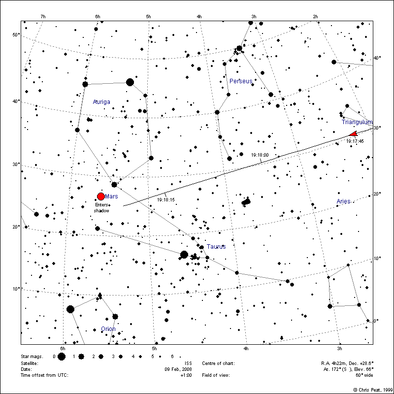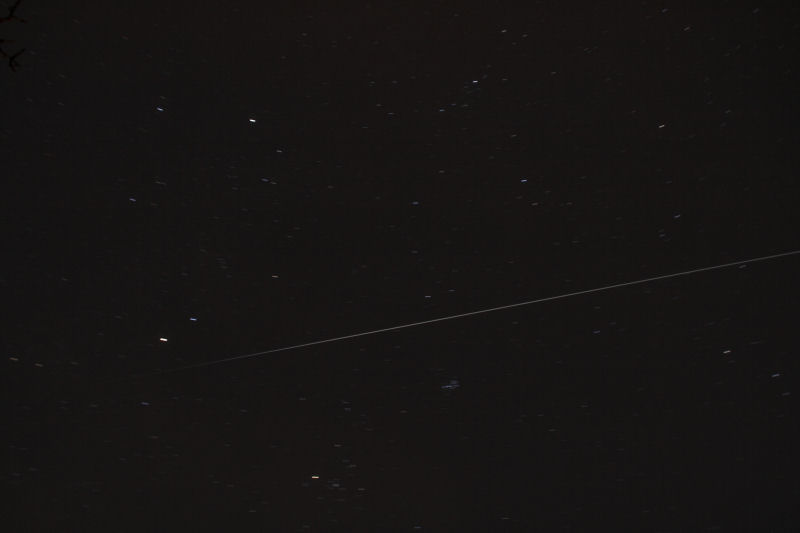 Die Vorhersage für Osnabrück von heavens above für die ISS: Und hier das Schauspiel über Osnabrück vor ungefähr einer Stunde! Die ISS tritt wie berechnet in der Nähe des Mars in den Erdschatten ein: Belichtungszeit ca. 3 min bei ISO 100 Gruß Robert |