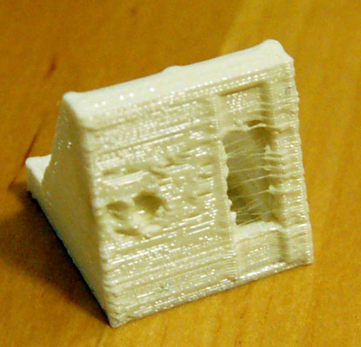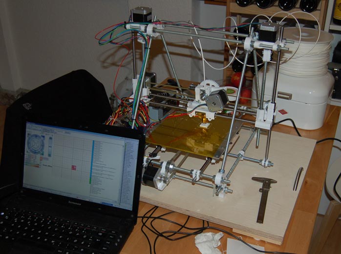 So, nachdem ich beim letzten Mal im Hackerspace den Extrusionsfaktor und das Baubrett halbwegs sauber eingestellt hatte, war heute wieder alles Kraut und Rüben. In der Zwischenzeit hat der Drucker immerhin ein Zuhause in Form einer Platte mit Füßen und Haltegriffen bekommen: