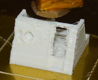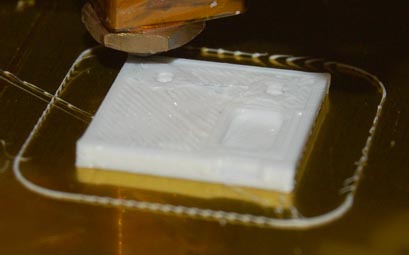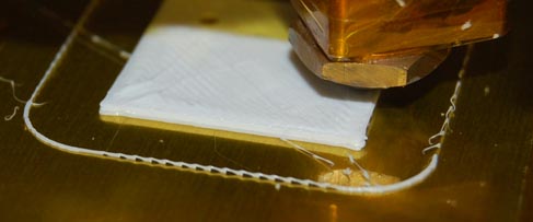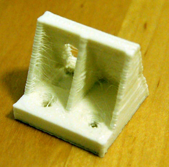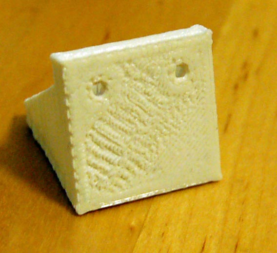 Außerdem habe ich die Zuführung des Filaments etwas verbessert, er verliert jetzt auch keine Schritte mehr. Beim Probedruck eines einfachen Quaders habe ich zuerst vermutet, dass nicht genug Material extrudiert wird, dann war es plötzlich zuviel und wurde verschmiert. Das Problem war schlussendlich, dass die Platte nicht komplett eben ist, sondern in der Mitte, wo man meistens druckt, 0,2 bis 0,3 mm über "Normal Null" liegt. Daher müssen die Z-Koordinaten entsprechend angepasst werden. Am Schluss war ich aber halbwegs zufrieden mit meinem Probedruck und dachte mir, folgendes Teil könnte man mal probedrucken: Es handelt sich hierbei um eine Halterung, die auf einem Brett festgeschraubt wird, und in dem ein Schiebeschalter und eine Status-LED für den Dentamag montiert werden sollen. Hier sieht man die ersten paar Ebenen. Zunächst wird eine Umrandung gedruckt, hier erkennt man durch die Tröpfchenbildung, dass die Extruderdüse offenbar doch etwas zu weit von der Baufläche entfernt ist. Das legt sich aber mit den weiteren Ebenen, wie man ja am Teil selbst erkennen kann. Im nächsten Bild sind schon die Aussparungen für den Schiebeschalter zu erkennen. Der weitere Druck verlief zunächst unspektakulär, aber wie Ihr Euch vielleicht denken könnte, ist der obere Abschluss der Öffnung für den Schiebeschalter nicht ganz einfach, und auch das Loch für die LED könnte sauberer sein. Naja, wegdremeln kann man immer noch. Dann müssen auch die ganzen spinnwebenartigen Fäden dran glauben. Hier seht Ihr die Unterseite des Teils. Die Lücken stammen wie schon bei der Umrandung von dem zu großen Abstand zur Baufläche. Normalerweise ist die Unterseite eines gedruckten Teils spiegelglatt (oder zumindest so glatt wie die Baufläche). Die Vorderseite des Teils ist deutlich zerklüfteter, es sieht auf dem Bild aber auch deutlich schlimmer aus als es ist. Nacharbeit erfordert auf jeden Fall das Loch für die LED, die Öffnung für den Schiebeschalter ist bis auf die Spinnweben eigentlich ganz gut geworden. Ein Blick hinter die Kulissen zeigt noch deutlich mehr Spinnweben, das ist aber unkritisch. Die Trichter für die Senkkopfschrauben sind auch gut zu erkennen, hier zeigt sich dann auch sehr gut, wie maßhaltig so ein Druck ist. Dafür habe ich mir aber schon andere Probedruckteile ausgedacht, v.a. was das Einpressen von Muttern angeht. So, erstmal bin ich recht zufrieden, zumal ich auch nicht genau weiß, an welchen Stellschrauben ich jetzt noch drehen muss, um ein besseres Ergebnis zu bekommen. Aber nächsten Donnerstag ist wieder 3D-Druck-Abend im Hackerspace Bremen, vielleicht schaffe ich es da vorbeizuschauen. Oliver |
