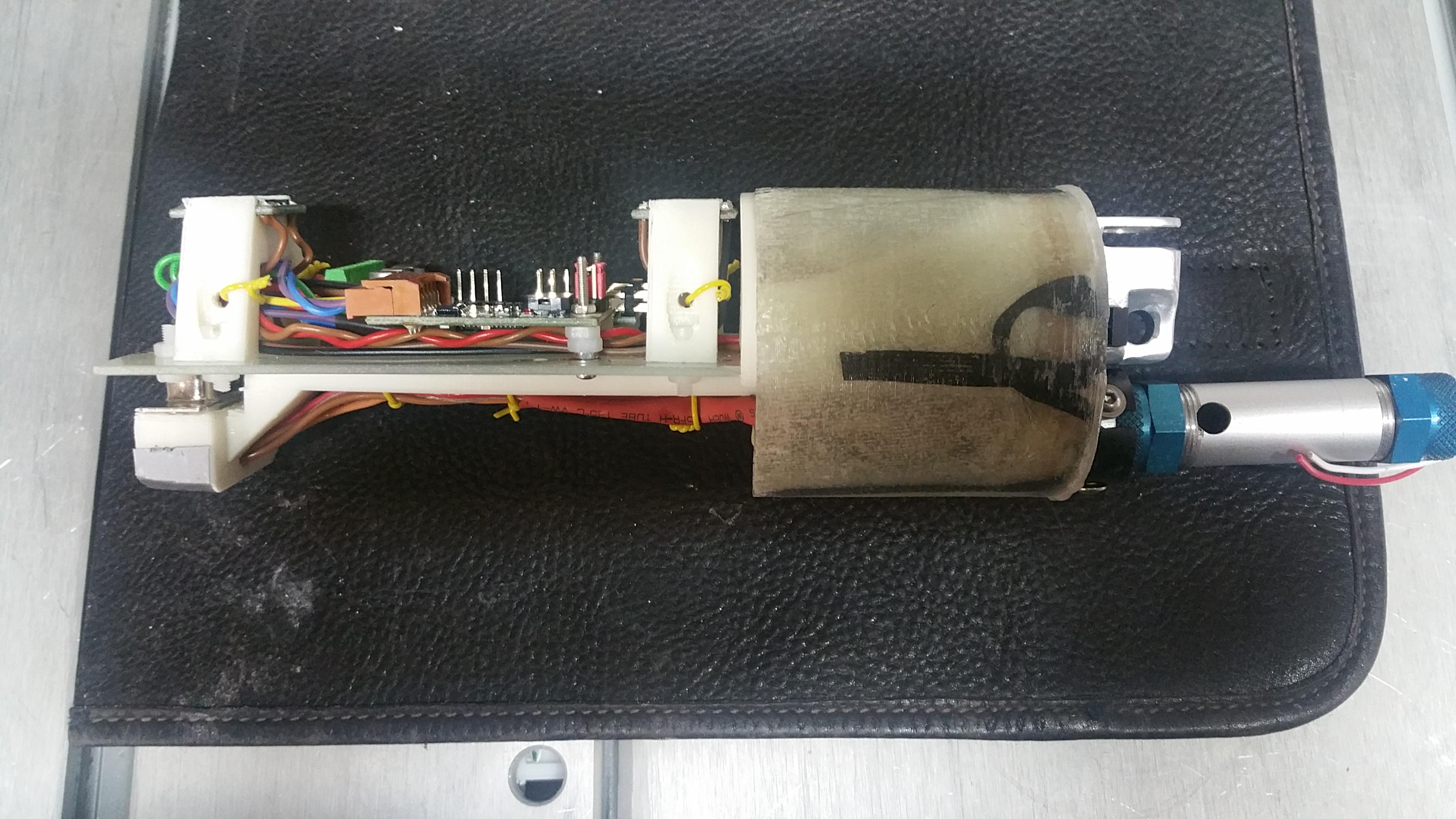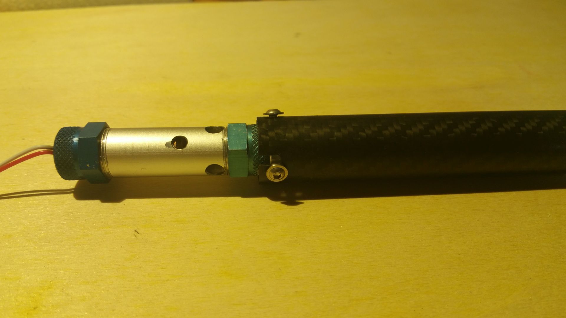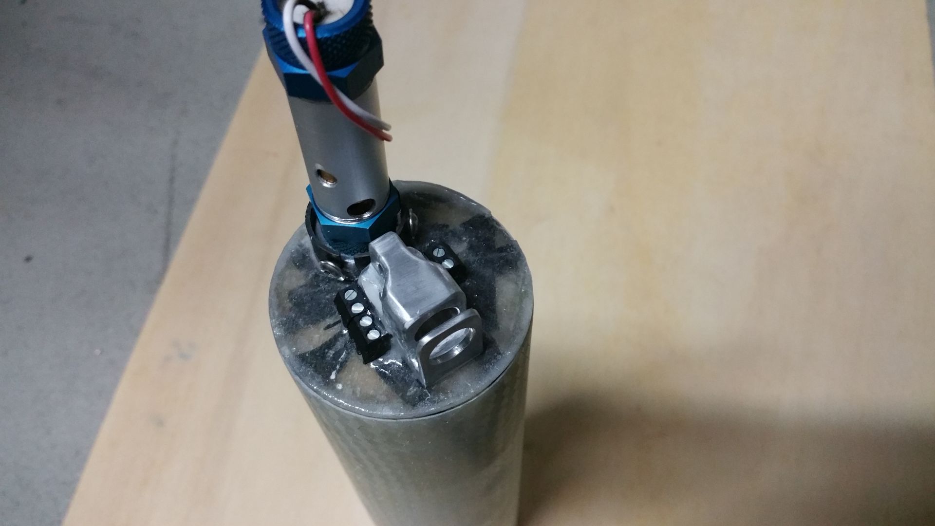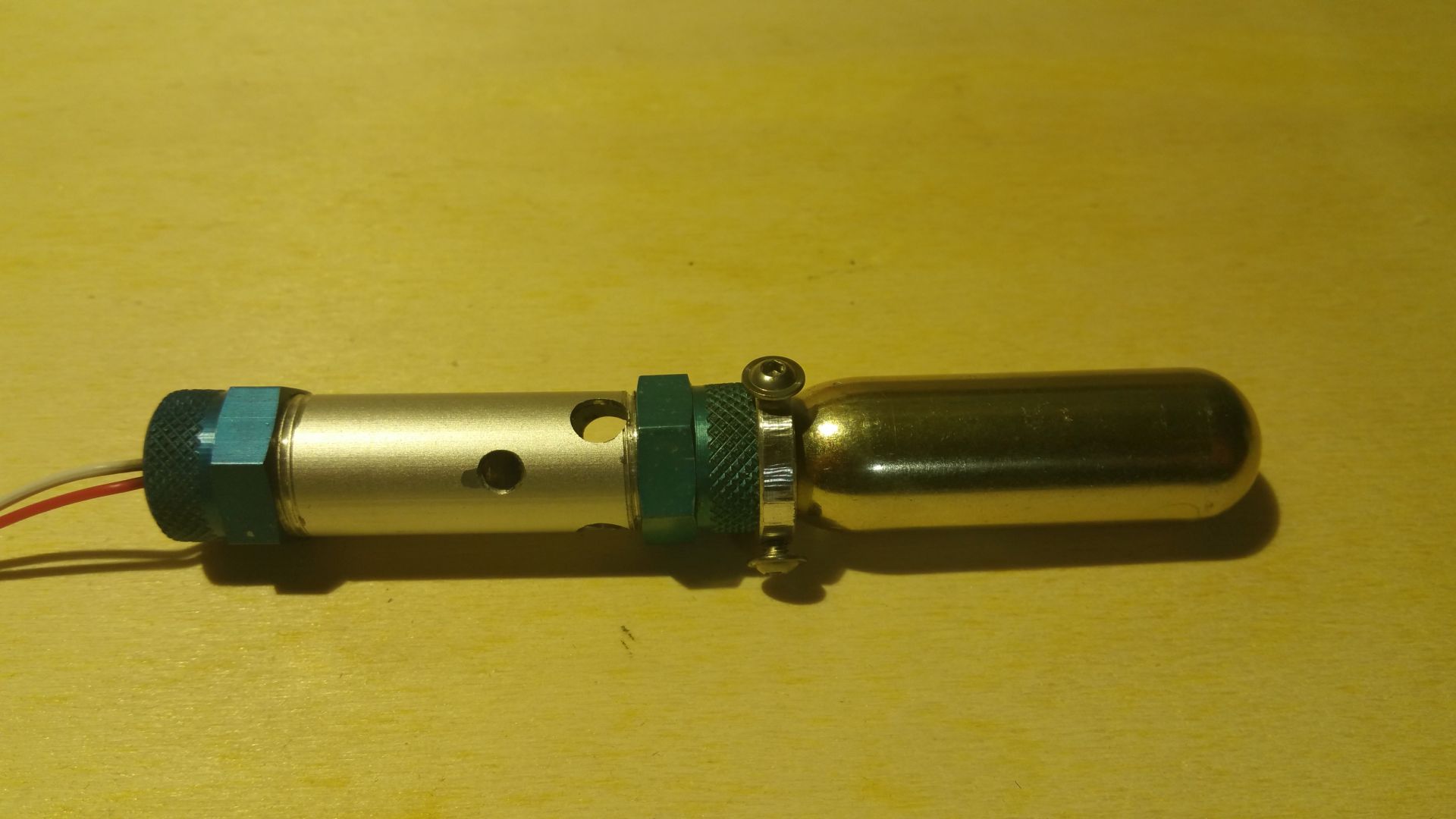 Das oben gezeigte CO2 Relaiys hat sich als unzuverlässig herausgestellt. Das Neue hat einen größeren Durchmesser, passt aber noch in das Aufnahme-rohr. Wiedereinmal zeigt sich, das man Hubraum nur durch noch mehr Hubraum ersetzen kann. Mit dem Größeren Volumen kann bei gleichem Druck mehr Masse in Bewegung gesetzt werden. Das Ergebnis ist, eine zuverlässige Auslösung der CO2 Kartusche.