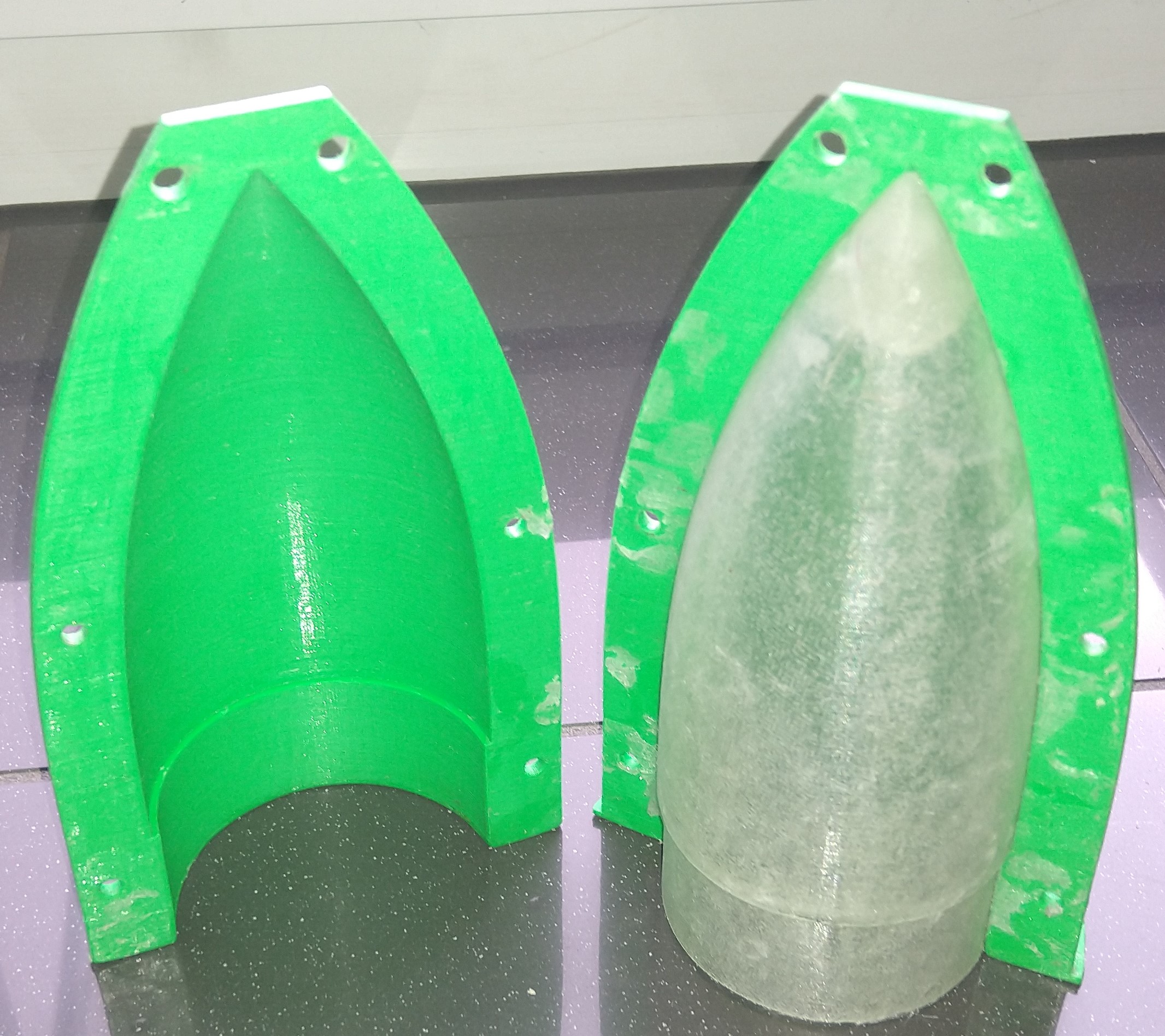 Es ist zum Mäusemelken, ich hatte mir den Zusatzaufwand angetan (von Ralf inspiriert), eine Form zu drucken für die Spitze incl. Kuppler. Leider trotz Vakuumaufgabe (innen und außen) keine saubere Kante zwischen Kuppler und Spitze. Ich denke, ich muss hier ohne Überlappung arbeiten, trotz Köperbindung im Gewebe, schafft es den Übergang nicht (bei 163 g/m2 Gewebe wohl kein Wunder bei den relativ kleinen Dimensionen der Spitze werden da die Experten sagen, trotz Vakuum, das hilft dann auch nicht recht, zumal schwer aufbringbar im Innern der Spitze). Botschaft an alle Anfänger in der Technik, wie ich es bin...die Erwartung, dass dies auf Anhieb super Resultate schafft, ist wohl etwas hoch gegriffen. Heute kommt der dritte Anlauf unter Einbeziehung der neuen learnings.