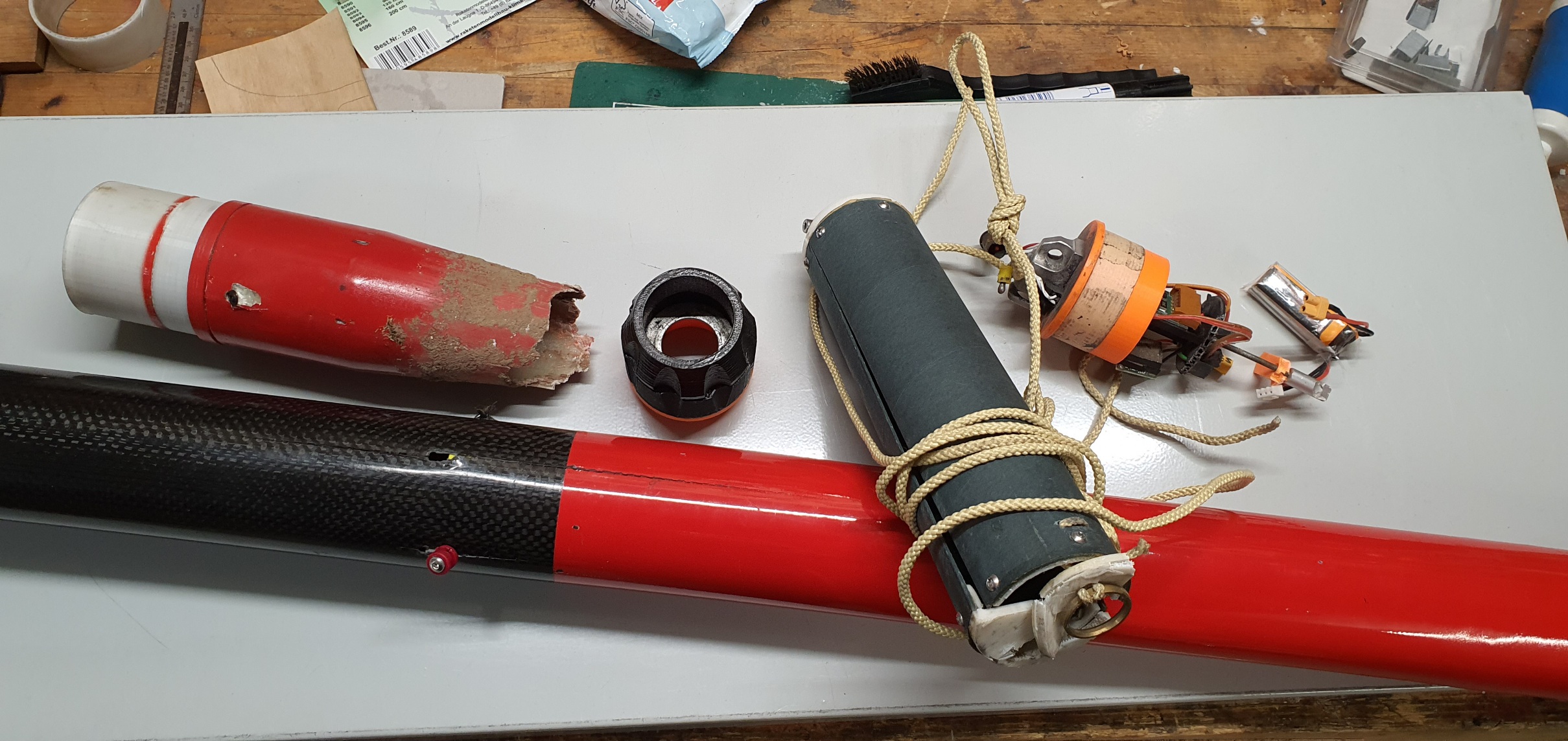 Hi Ralf, gut dass nichts passiert ist. Schadensursachenanalyse ist wichtig und gut für uns alle, um dazulernen. Deswegen schonmal vorab danke für weitere Infos. Ich habe am gleichen Tag auch ein Modell nach 10 Jahren problemloser Flüge ziemlich geschrottet (da nach so langer Ehe mein Herz daran hängt, werde ich es wiederbeleben, koste es, was es wolle....). Leider scheint ein Anfängerfehler die Ursache gewesen zu sein: Ich hatte bisher immer Pyroflocken in Verwendung, wollte diesmal ersatzweise Schwarzpulver nehmen, da der Ausstoß bei hohen Flügen (1000 m) gegen blauen Himmel besser sichtbar ist durch die erzeugte Rauchwolke. Leider habe ich auf Ausstoßtests vorher verzichtet und damit Aufwand an der falschen Stelle gespart (dachte immer, Ausstoßtest ist was für Weicheier...echte Männer können das per Auge einschätzen  ). Der Ausstoß ist durch Überdosierung so heftig erfolgt, dass es einen Abriß der ersten Stufe gab, die ohne Drog dann am Boden eingeschlagen ist. Der Retainer ist auch rausgerissen, der Schubring aus der Nut des Motorcasings verschoben, ich interpretiere beides als Folge des Ausstoßes und nicht der seitl. Landung), entweder durch die Trägheitskräfte des Motorcasings bei Shockcordabriß oder durch Druckaufbau von innen heraus. Wie auch immer Hochmut kommt vor Fall, ich werde die Basics von Schwarzpulverdosierung nochmal durchgehen...mir Zeit für Ausstoßtests nehmen...grundsätzlicher Verzicht auf SP wäre nämlich eher was für Weicheier....außerdem riecht das doch so gut  Grüße Thomas