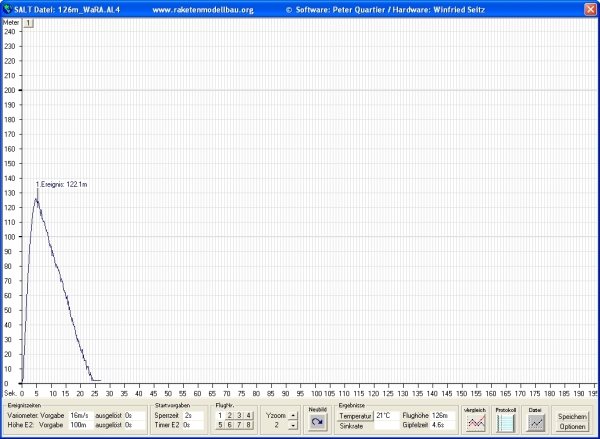 Eine neue Marke ist gesetzt  in der offenen Klasse Am Wochenende flog meine Booster I auf 126m. Aufgezeichnet von einem SALT Micro. Beim NRT auf dem Pad... Kurze Zeit später auf 126m Zur Rakete: Volumen 4,75l Wasser etwa 1,5-1,6l Druck 15bar Drucktank aus 1,5l mit GFK verstärkt. Fallschirmauslösung durch TommyTimer. Grüße Scorpion_XIII