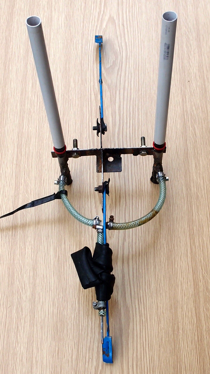 Oben, mittig auf der Booster-Schubstruktur sitzt das Staging-System. Es beinhaltet eine Startkupplung für 20 mm Düsen mit zweiteiliger Launch Tube. Der untere Teil ist ein 16 mm Stahlrohr, das am unteren Ende zugeschweißt wurde und an dessen Seite ein dünneres Rohr angeschweißt wurde, an dem ein Stück Druckschlauch mit einem Autoventil angebracht wurde. An beiden Enden des Schlauchs sind Schlauchschellen angebracht. Auf das obere Ende des Stahlrohrs wurde ein PVC-Rohr geschoben (die optimale Länge muss noch gefunden werden, aber es sollte über den Wasserfüllstand hinausragen). Es ist gegen das Stahlrohr mit mehreren Lagen Teflonband abgedichtet. Zwischen Stahlrohr und Flaschenhals sitzt ein passender O-Ring (siehe Teil 1). Damit dieser beim Druckaufbau nicht einseitig nach unten rutscht, ist ein wenige mm breiter PET-Streifen rundherum mit Duct-Tape auf dem Stahlrohr aufgeklebt, der gerade so in den Flaschenhals passt, aber den O-Ring stoppt. Die Flasche der oberen Stufe wird bis zur Stufentrennung mit einer Klammer aus PET fest auf der Launch Tube gehalten. Die Klammer wurde aus einem Stück einer Flasche durch Verformung unter Hitze mithilfe eines Bügeleisens hergestellt.