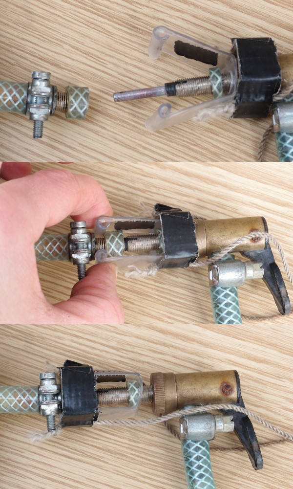 Die schnell lösbaren Druckluft-Verbindungen hab ich letztes Jahr entwickelt. Eine Verbindung besteht aus zwei abgesägten Fahrrad-/Autoventil-Schäften, die aufeinander gepresst werden und über eine innen hineingesteckte rohrförmige Dichtung verbunden und abgedichtet werden. Die Dichtung besteht aus einem Stück eines Kunststoff-Trinkhalms mit einer Lage Duct-Tape darüber. Damit die Dichtung beim Aufeinanderpressen nicht einknickt oder Falten bildet wird innen noch ein Stahlstift hinein gesteckt, der gerade so in die Dichtung hinein passt. In den Stift wurde eine Längsnut gesägt, um die Druckluft durchzulassen. Wenn das Gegenstück der Druckluft-Verbindung ein Autoventil ist - wie im Falle der Verbindung zur zweiten Stufe - dient der Stift auch dazu, das Ventil offen zu halten, bis die Verbindung gelöst wird. Der Anpressdruck wird von einer Klammer aufgebracht, die aus einem Stück PET gefertigt wurde (durch Erhitzung mit einem Bügeleisen). Auf beide Ventilschäfte ist jeweils ein kurzes Stück Schlauch geschoben. Die PET-Klammer umgreift mit beiden Enden das eine Stück während sie mittig auf das andere Stück drückt. Um die Klammer geschlossen zu halten ist sie von einem Vierkantrohrstück umgeben, das ebenfalls aus PET geformt wurde und mit Duct-Tape zusammengehalten wird. Es ist an gegenüberliegenden Seiten mit einer stabilen Schnur verbunden. Wenn man an der Schnur zieht, kann man schnell und mit wenig Kraft die Verbindung lösen. Bei Bodentests stellten sich diese Verbindungen als ausreichend dicht bis 7 bar heraus, aber im Flugbetrieb gab es gelegentlich schon deutliche Lecks ab 4 bar, wenn die Länge der Dichtung nicht genau stimmte und der Anpressdruck zu niedrig war. Letzterer ist einstellbar über die Position der Schlauchstücke auf den Ventilschäften und Erstere ist einstellbar mithilfe einer Schere oder mit Ersatz-Dichtungen, die zumindest schnell hergestellt sind und fast nix kosten.